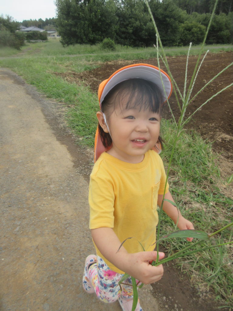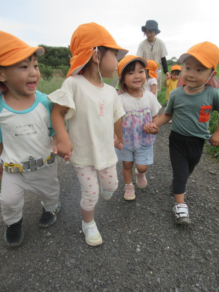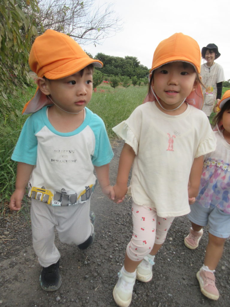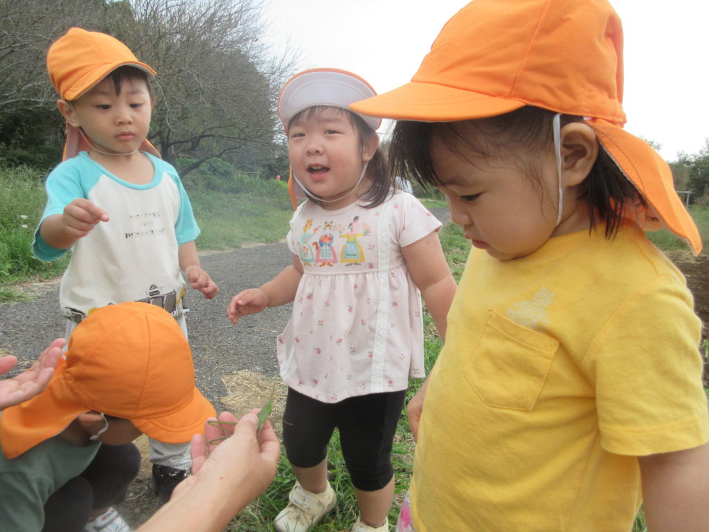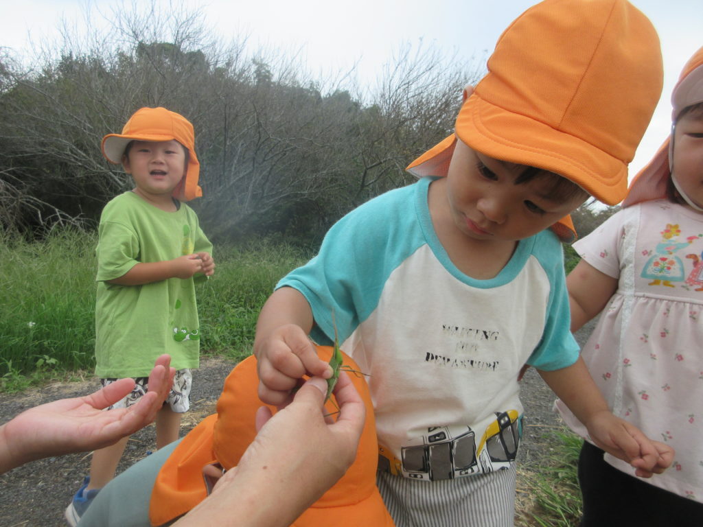 途中でバッタを発見👀先生は子どもたちに見せようと捕まえました💦
