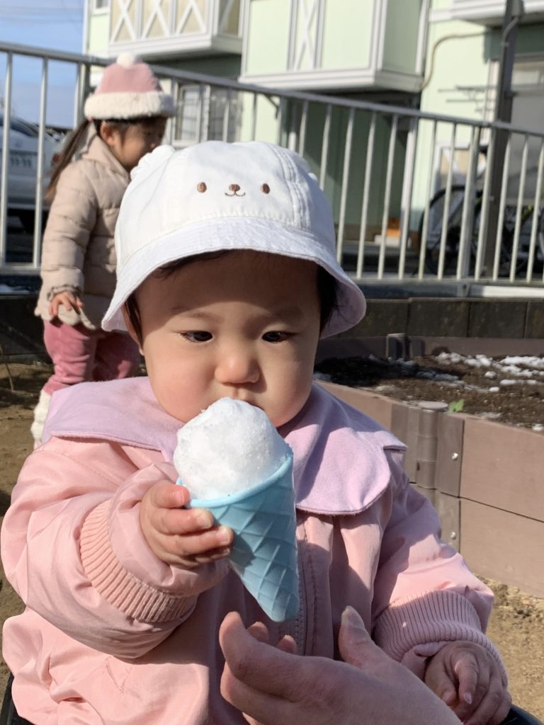 残ってる雪を見つけながら、立ち止まったり、触ったり。