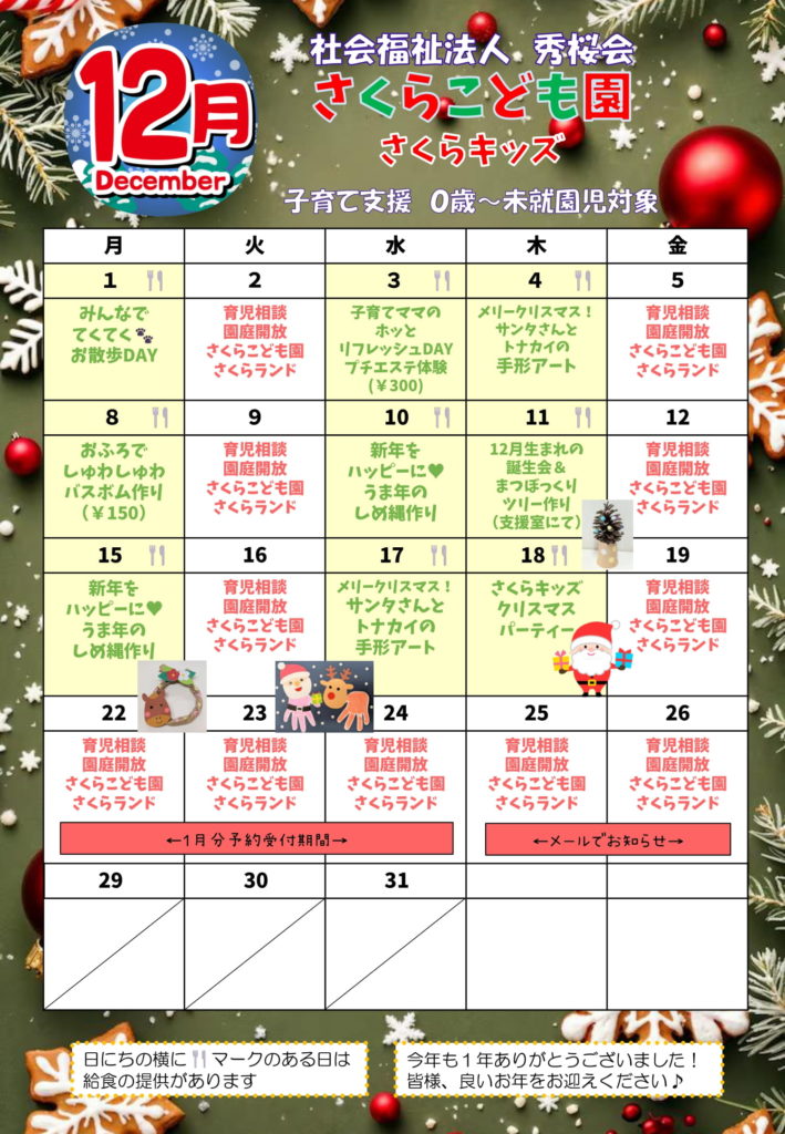 | 金曜日 | 育児相談、園庭開放、さくらランドにて子育て支援実施 |