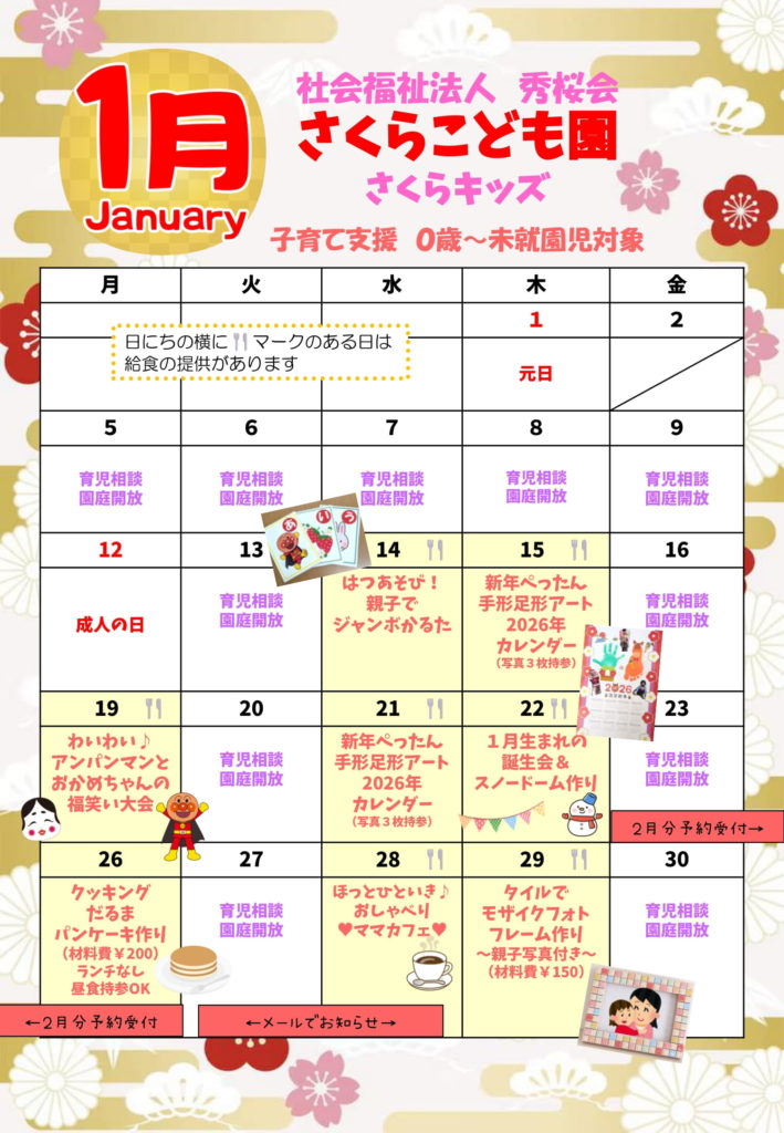 ※さくらキッズに参加の際は、お子さまの水筒とお着替えの持参をお願い致します。